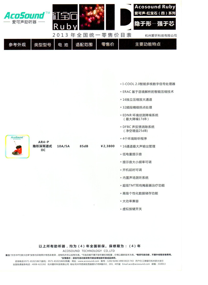 杭州爱可声助听器【红宝石四】系列全国统一助听器价格表¥23800